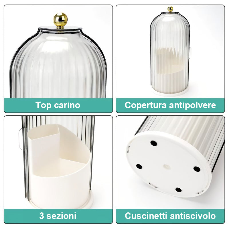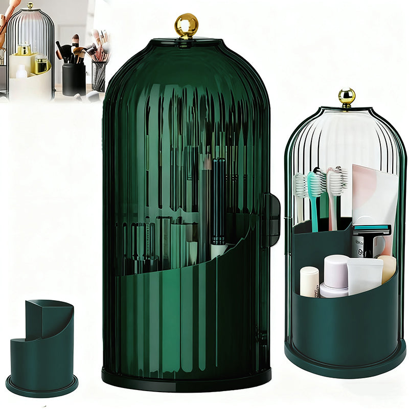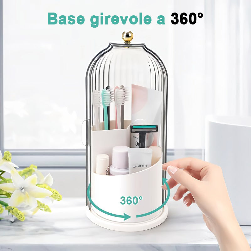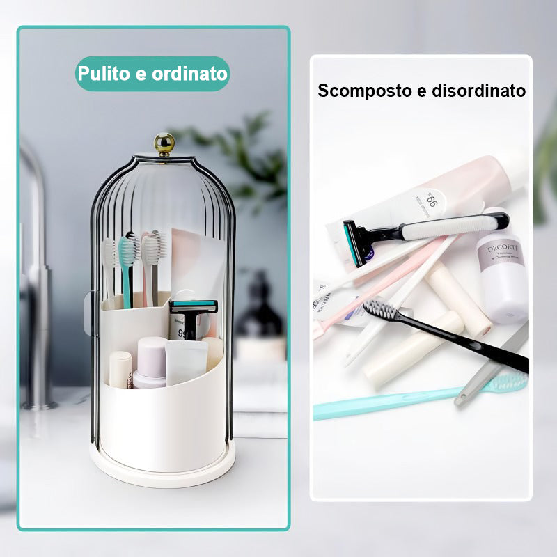 L'interno del portaspazzolino ruota di 360°, consentendo un facile accesso a spazzolini, dentifricio, pennelli per il trucco e altro ancora da qualsiasi angolazione. Basta ruotare il contenitore per trovare rapidamente ciò di cui hai bisogno, assicurandoti che tutto sia a portata di mano e risparmiando spazio.