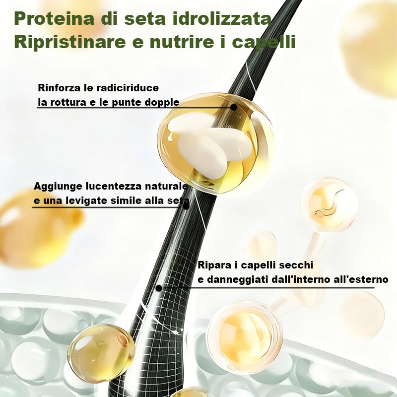 • Rinforzante con aminoacidi: gli aminoacidi chiave aiutano a rafforzare i capelli dall'interno, aumentandone la lucentezza e riducendone la rottura a lungo termine.
